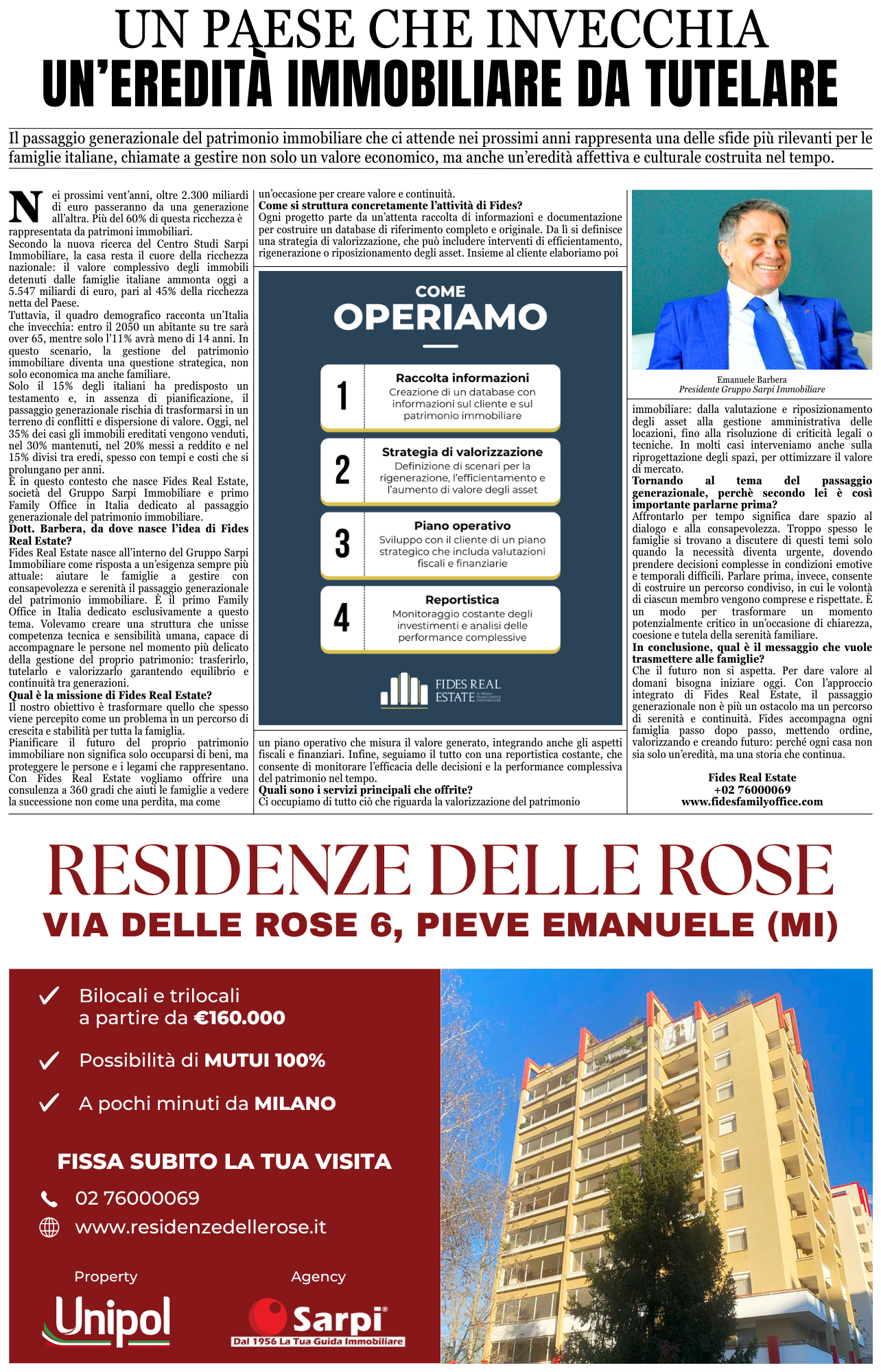 È una nicchia di mercato che ha bisogno di servizi precisi, innanzitutto di assistenza professionale per valorizzare il proprio patrimonio immobiliare e per creare un assetto adeguato in prospettiva del passaggio di mano al venir meno del proprietario attuale. È qui che arriva la soluzione Fides Family Office RE, spiega Emanuele Barbera, Ceo del Gruppo Sarpi Immobiliare: "Siamo al fianco delle famiglie che vogliono valorizzare il proprio patrimonio immobiliare o che, in alternativa, intendono costruirne uno per lasciare un passaggio generazionale di valore".